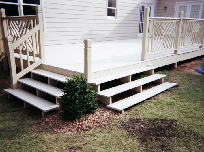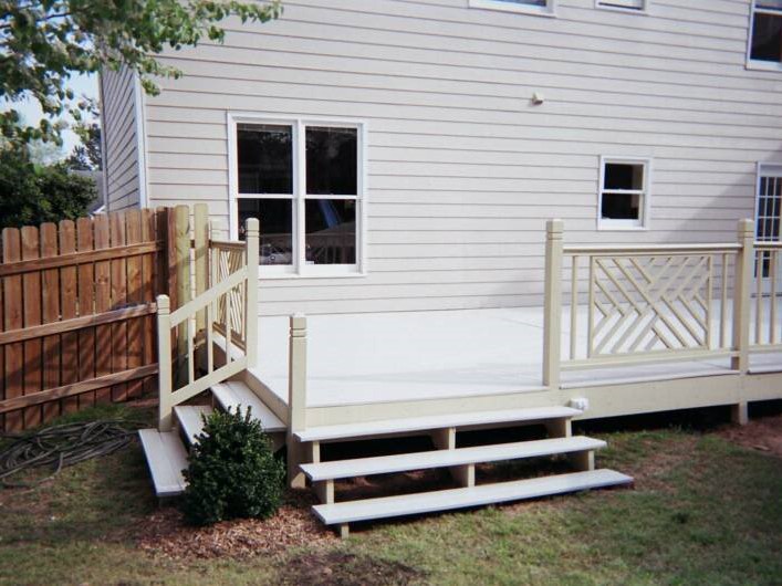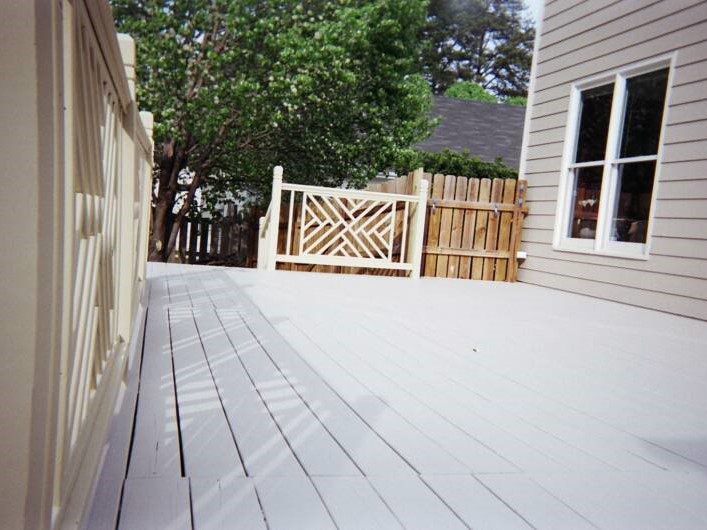 We took this dark and dreary deck and added 16 feet with corner steps.We striped the old finish and applied Sherwin Williams Duration to the railings and Behr solid color penetrating stain to the surface. The addition of two GFI power outlets eliminated the need for unsightly extension cords